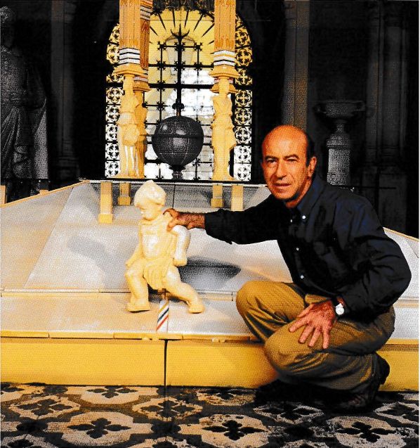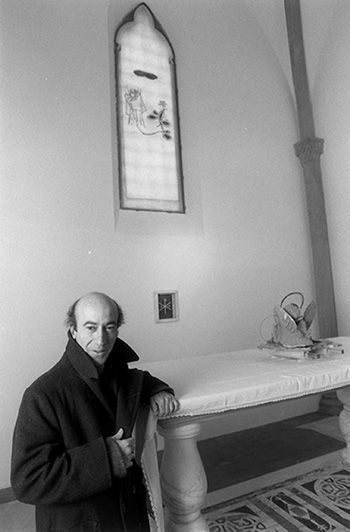 Luciano Schifano davanti alla Fontana delle 3G installata al Museo Civico di Padova in occasione della mostra I due soli, 2000