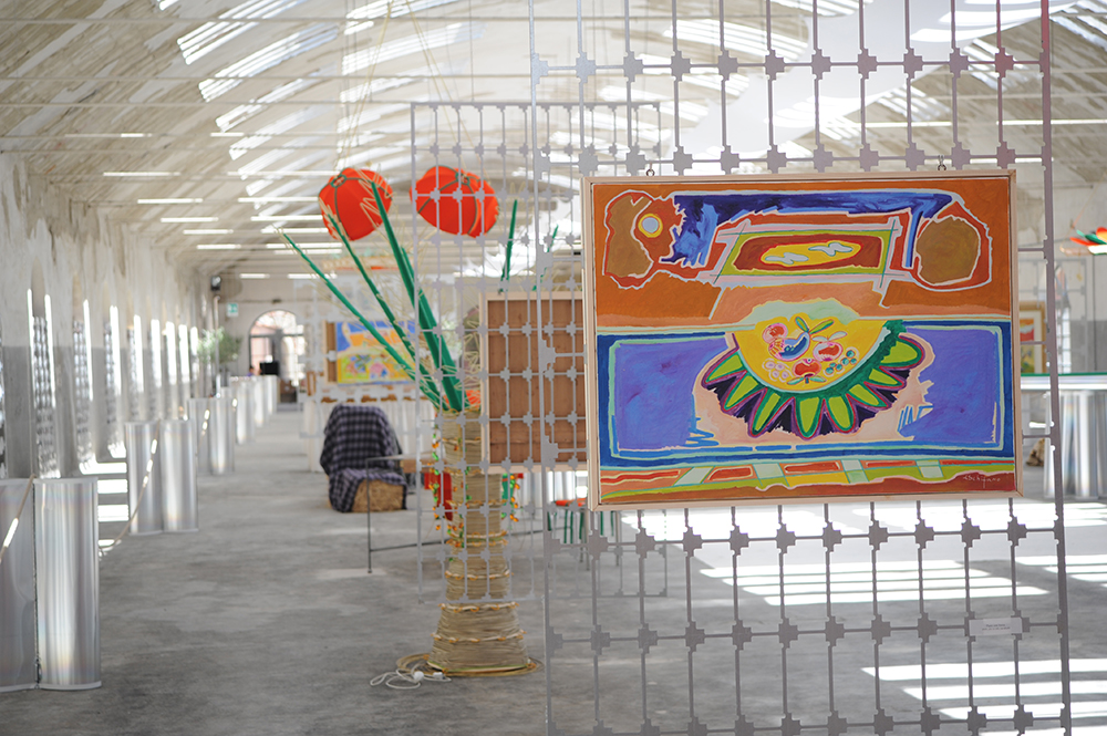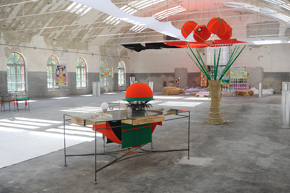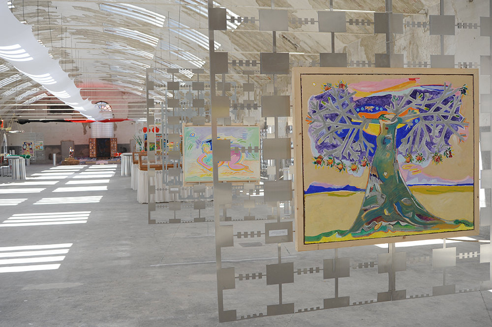 Struttura in alluminio con l'opera L'impollinazione avverrà domani?, 2011, tempera su sughero, 89x104 cm