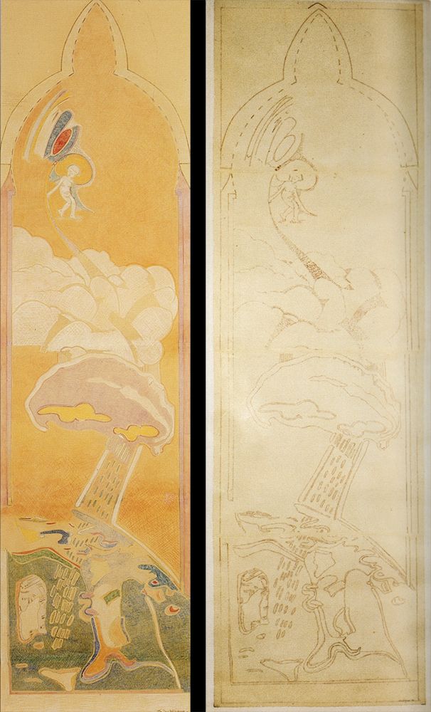 Progetto per la vetrata Sorella Acqua e Sorella Terra, 1990, china su carta lucida, 281,5x83 cm (dx); 1990, pastello su carta rintelata 276x76 cm (sin.)