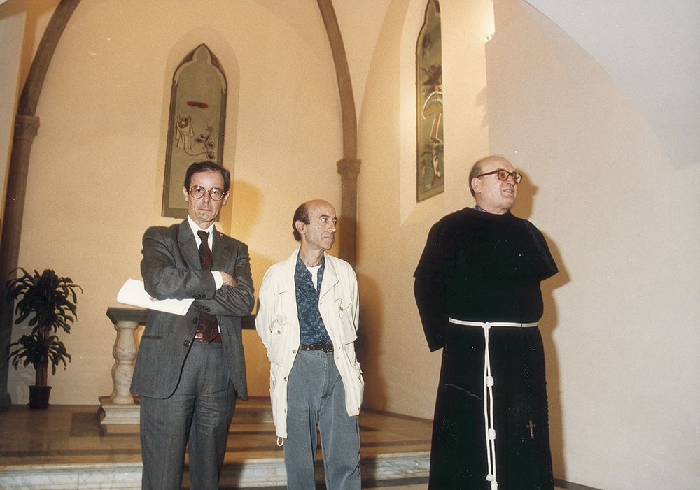 Inaugurazione delle vetrate: Luciano Schifano (centro) con Padre Franchi (dx)